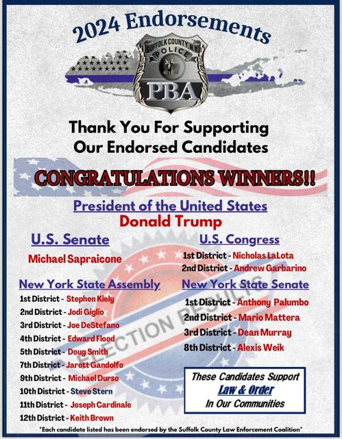 The Suffolk County PBA wants to thank all of our endorsed candidates who stepped up and ran to make our communities safe. Whether you won or lost, your efforts were unparalleled. A special congratulations to our winners. This victory is not just for them, but for all those who rightfully want public safety in our communities.